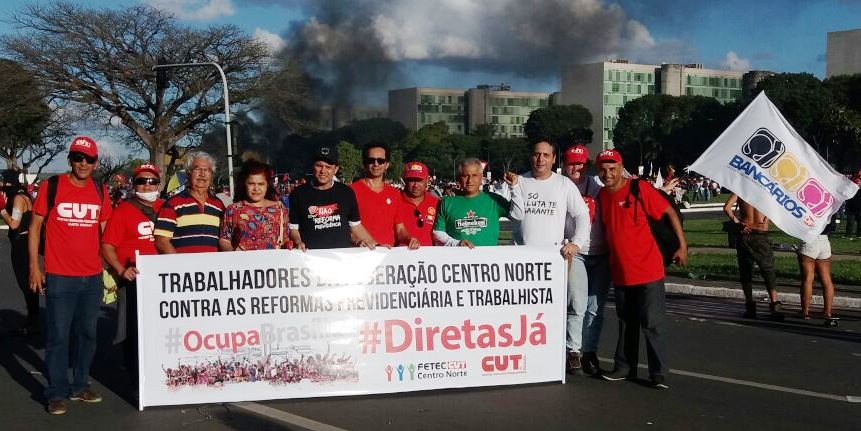 Cerca de 200 mil trabalhadores participaram nesta quarta-feira 24 da maior marcha já realizada sobre Brasília, para exigir a retirada das reformas trabalhista e da previdência, a renúncia do presidente ilegítimo Michel Temer e eleições diretas já. A Federação dos Bancários do Centro Norte (Fetec-CUT/CN) e seus 12 sindicatos filiados participaram do Ocupa Brasília, que foi violentamente reprimida pela PM do Distrito Federal e até pelo Exército, chamado por Temer como na época da ditadura militar, produzindo dezenas de feridos, inclusive por arma de fogo.