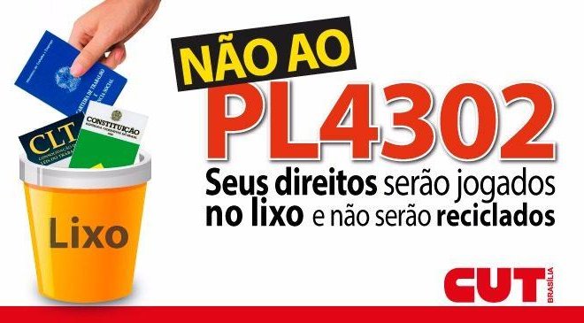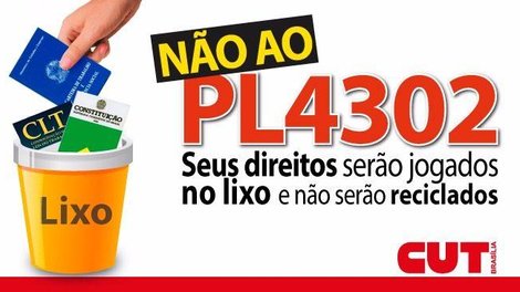 Nesta terça (21), será votado no Congresso Nacional, o nefasto Projeto de Lei 4.302/98 que libera a subcontratação e precariza ainda mais as relações de trabalho; decreta indiretamente o fim dos concursos públicos; desmonta as categorias profissionais; joga no lixo os acordos e as convenções coletivas; enfraquece as entidades de classe como os sindicatos, as federações e confederações, promovendo o fim dos instrumentos de luta da classe trabalhadora.