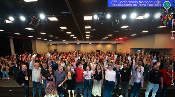 Após dois dias de debates, a 27ª Conferência Nacional dos Bancários aprovou neste domingo 24 de agosto em São Paulo o plano de lutas da categoria para o próximo período que inclui desde questões corporativas como mais saúde e melhores condições de trabalho e combate às metas abusivas e ao assédio moral, defesa do emprego e fim da terceirização, até temas urgentes da conjuntura política e econômica, como a defesa enfática da democracia, da soberania nacional e dos bancos públicos, hoje sob ataques do governo Trump com apoio da família Bolsonaro e seus seguidores, o que configura um crime de traição à pátria que precisa ser punido.