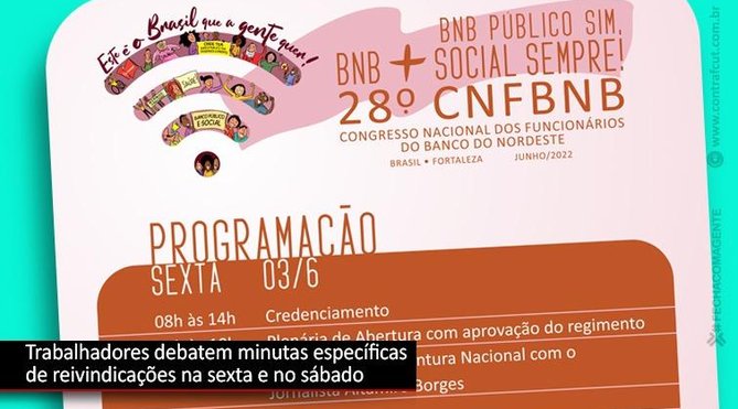 O 28º Congresso Nacional dos Funcionários do Banco do Nordeste (BNB) acontece nesta sexta-feira (3) e sábado (4), em formato híbrido. A parte presencial do evento será em Fortaleza (CE).