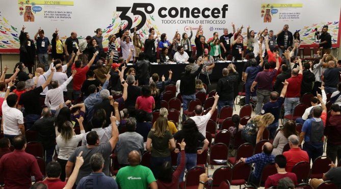 Os participantes da 35° Conferência Nacional dos Empregados da Caixa (Conecef) aprovaram, durante o evento, uma moção de apoio e solidariedade ao bancário Pedro Eugênio Beneduzzi Leite que, por meio de ação jurídica impetrada pelo atual presidente da Caixa, Pedro Guimarães, vem sofrendo censura e repetidos ataques ao seu direito de liberdade de expressão.