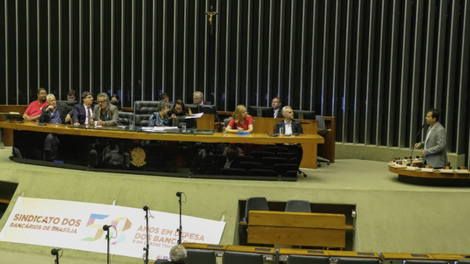 No plenário Ulysses Guimarães, bancários e bancárias celebraram a atuação histórica do Sindicato em lutas emblemáticas da categoria e da sociedade. Fundada em 23 de novembro de 1961, a entidade atuou como protagonista em diversos momentos históricos da capital federal, desde a construção até os dias atuais.