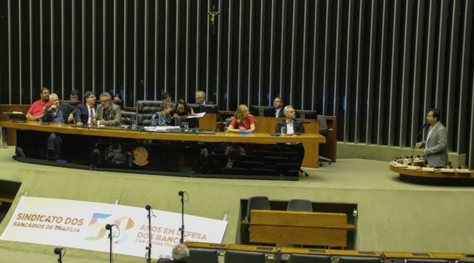 À mesa, entidades e personalidades que fazem parte da trajetória do Sindicato estavam representadas. Além de Erika Kokay, estavam Kleytton Morais, bancário do BB e presidente do Sindicato; Jacy Afonso, ex-presidente do Sindicato e atual secretário de Formação Sindical da Fetec-CUT/CN; José Avelino, representando a CUT Brasília; Rosane Alaby, bancária aposentada do Santander e ex-diretora do Sindicato; Ronaldo Lustosa, bancário do BRB e secretário de Assuntos Parlamentares do Sindicato; Clotário Cardoso, diretor de Administração da Fenae; José Eymard Loguercio, assessor jurídico do Sindicato; e Max Leno de Almeida, economista e técnico do Dieese.