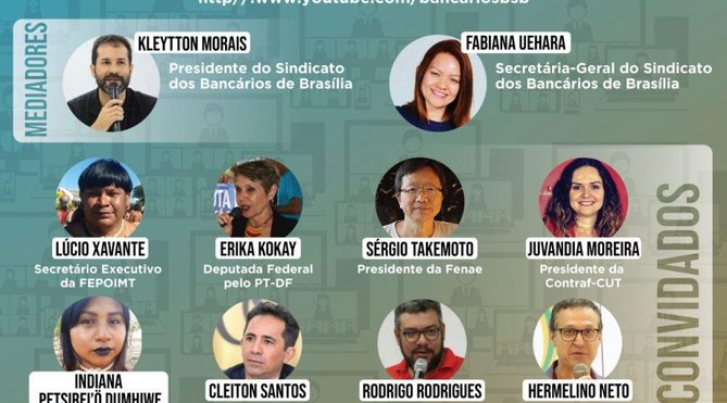 Entre os convidados estão Juvandia Moreira, presidenta da Confederação Nacional dos Trabalhadores do Ramo Financeiro (Contraf-CUT); Cleiton dos Santos, presidente da Federação dos Bancários do Centro-Norte (Fetec-CUT/CN); Sérgio Takemoto, presidente da Fenae; Erika Kokay, bancária e deputada federal; e Carlos Bruno, dirigente da CTB. Também participarão Lúcio Xavante, secretário executivo da FEPOIMT, e Indiana Petsirei’Ö Dumhiwe, da Terra Indígena Parabubu e servidora da Funai.
