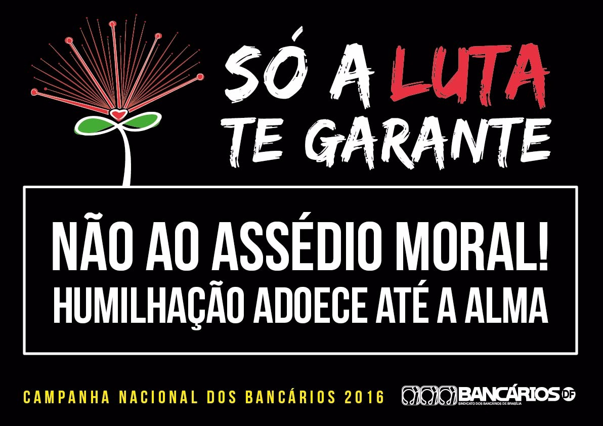 Segundo um estudo do Sindicato publicado na cartilha 100% não é mais o limite, cerca de 40% dos bancários e bancárias do Distrito Federal estão em risco de adoecimento, 60% já sofreram assédio moral no ambiente de trabalho e 70% vivenciam a indignidade. O levantamento foi feito a partir da coleta e análise de dados de 2.111 bancários, com idade média de 38 anos e cerca de 13 anos de banco.