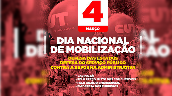 A pauta do Dia Nacional de Mobilização inclui a defesa das empresas estatais que são estratégicas para o desenvolvimento do país, com geração de emprego e renda; defesa do serviço público que vem sendo sucateado desde o governo de Michel Temer (MDB-SP) e que agora sofre mais ataques com a proposta de reforma Administrativa; e ainda luta pelo auxílio emergencial para garantir condições de sobrevivência àqueles que perderam sua renda durante a pandemia.