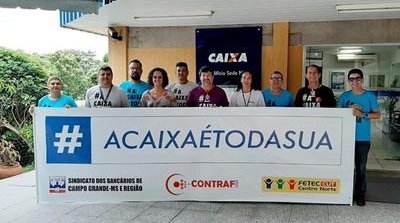 Em Campo Grande, os diretores do SEEBCG-MS utilizaram as camisetas da campanha #ACaixaÉTodaSua e se reuniram com os bancários para um debate sobre a importância do banco público e os ataques que a instituição e os bancários vêm sofrendo. Foi distribuída ainda uma Carta Aberta aos empregados e à população, na qual as entidades representativas denunciam a estratégia de desmonte imposto pelo atual governo contra a Caixa e outras empresas públicas. Clique aqui e leia a carta na íntegra.