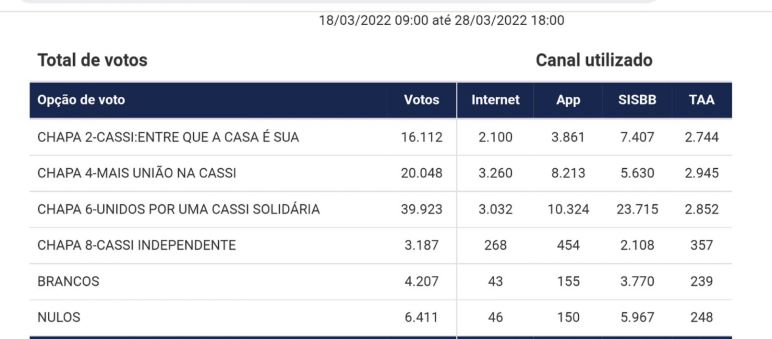 As chapas 6 e 77, Unidos por uma Cassi Solidária, que tiveram o apoio da Federação dos Bancários do Centro-Norte (Fetec-CUT/CN) e Confederação Nacional dos Trabalhadores do Ramo Financeiro (Contraf-CUT), outras federações, sindicatos e da maioria das entidades associativas do país, foram as mais votadas nas eleições da Caixa de Assistência dos Funcionários do Banco do Brasil (Cassi) e vão assumir as diretorias de Risco Populacional, Saúde e Rede de Atendimento, além dos conselhos Deliberativo e Fiscal a partir de junho de 2022 até maio de 2026.