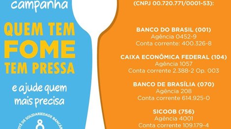O Sindicato conclama bancárias e bancários, sócios e ainda não sócios, e sociedade em geral, a exemplo da feliz campanha do Betinho “Quem tem fome, tem pressa”, a doarem valores cujo parâmetro corresponde a um dia do vale-refeição, ou seja, R$ 36,69, uma conquista histórica e assegurada nos acordos coletivos e convenção da categoria.