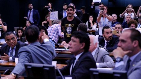 Dentro do plenário, o clima entre os manifestantes foi tranquilo por boa parte da reunião, com poucas palavras de ordem e muitos cartazes contra e a favor da medida. Já com a segunda suspensão, houve bate-boca. Do lado de fora, estudantes gritavam “mordaça não” para contestar a medida.