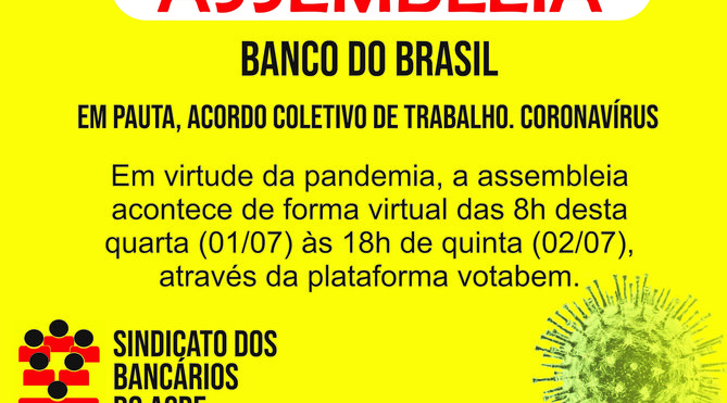 A referida assembleia terá como pauta o acordo coletivo de trabalho emergencial, a ser celebrado entre as entidades representativas de classe e o Banco do Brasil, em face do novo Coronavírus.
