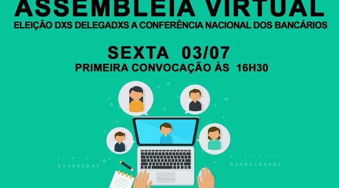 O Sindicato dos Bancários de Mato Grosso (SEEB/MT) convoca os bancários da base para participar da Assembleia Virtual nesta sexta-feira (03/07) às 16h30, em primeira convocação e 17h, em segunda convocação. Em decorrência da pandemia causada pelo novo coronavírus (Covid-19), a Assembleia será realizada por videoconferência.