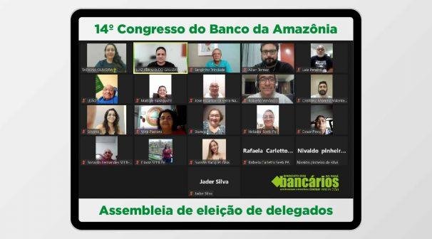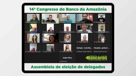 Nos próximos dias 27 e 28 de maio será realizado o 14º Congresso Nacional do Banco da Amazônia. Por esse motivo, o Sindicato dos Bancários do Pará realizou na noite dessa quinta-feira 12/05 a assembleia virtual para eleição dos representantes do estado na atividade que irá debater e aprovar a minuta de reivindicações dos empregados e empregadas do Banco na Campanha Nacional 2022.