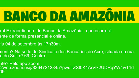 O Sindicato dos Empregados em Estabelecimentos Bancários do Estado do Acre, inscrito no CNPJ/MF sob o n.º 05.389.697/0001-58, registro sindical n.º 006.055.02163-7 por seu presidente abaixo assinado convoca todos os empregados do Banco da Amazônia S/A de base territorial do Estado do Acre para Assembléia Geral Extraordinária que acontecerá dia 04 de setembro de 2020 às 17h30min em primeira convocação e às 18h00min em segunda convocação, sendo realizado de forma presencial, no endereço da Rua Rio grande do Sul, nº069 Bairro Centro, e remota, através de plataforma de vídeoconferência ZOOM, link: https://us02web.zoom.us/j/83647212845?pwd=ZSt0K1ArVlk2UDRqYW4wT1dWV0tFQT09 , para discursão e deliberação acerca da seguinte ordem do dia: