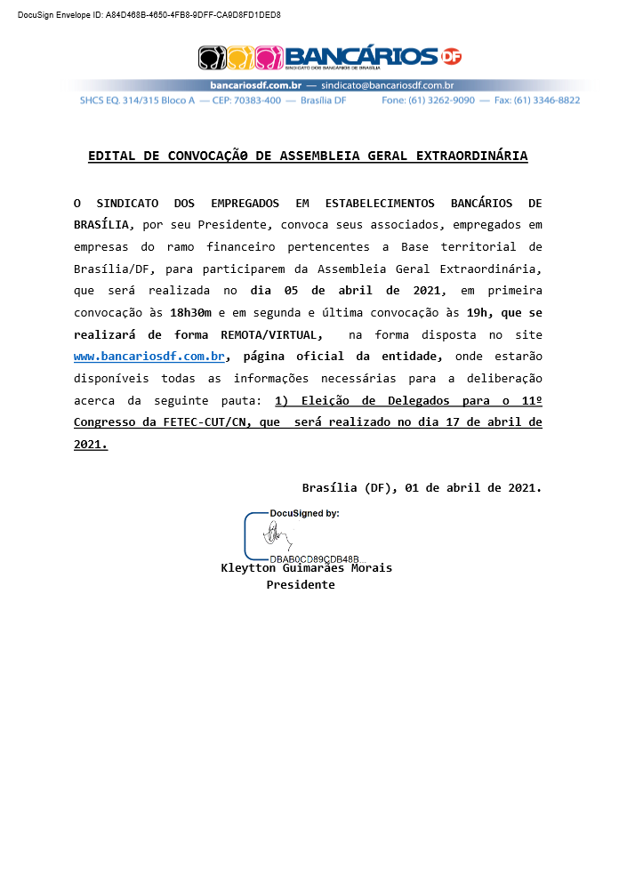 O Sindicato convoca os bancários sindicalizados, de bancos públicos e privados, para a assembleia geral extraordinária remota que será realizada na segunda-feira (5), às 19h, e que vai eleger os delegados da base de Brasília ao 11º Congresso da Fetec-CUT/CN (Federação dos Trabalhadores em Empresas de Crédito do Centro Norte).