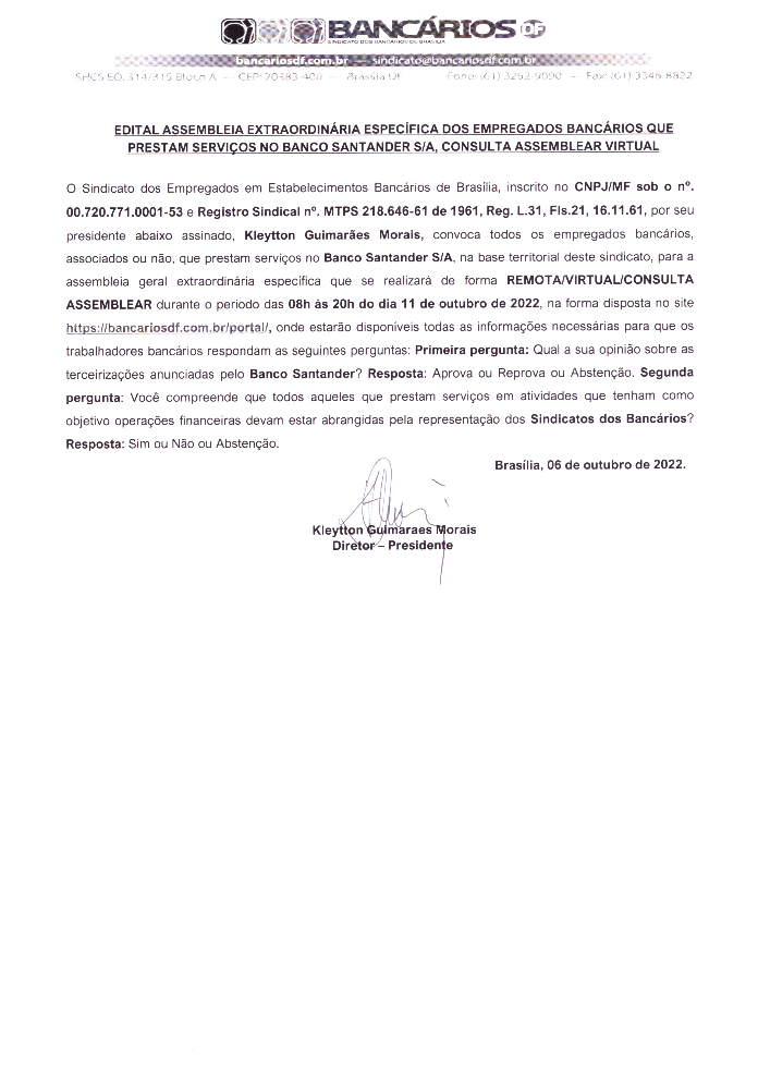 Tendo em vista as alterações unilaterais promovidas pela Santander envolvendo milhares de bancários que passaram a ser enquadrados em outras categorias profissionais, o Sindicato convoca para assembleia específica remota para consulta a todos os trabalhadores da instituição sobre o tema.