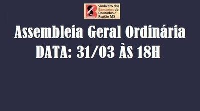 O Sindicato dos Bancários de Dourados e Região MS, convoca os bancários e trabalhadores do ramo financeiro, sócios do sindicato, para assembleia geral ordinária, que se realizará nesta quinta-feira, 31 de março de 2022, às 17;30h em primeira convocação e, às 18h em segunda convocação, com a seguinte pauta: