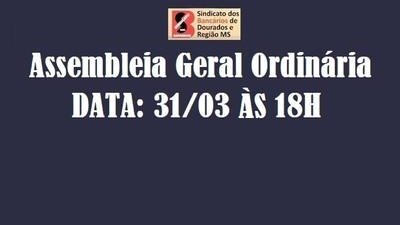 O Sindicato dos Bancários de Dourados e Região MS, convoca os bancários e trabalhadores do ramo financeiro, sócios do sindicato, para assembleia geral ordinária, que se realizará nesta quinta-feira, 31 de março de 2022, às 17;30h em primeira convocação e, às 18h em segunda convocação, com a seguinte pauta: