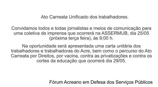 Na oportunidade será apresentada uma carta unitária dos trabalhadores e trabalhadoras do Acre, bem como o percurso do Ato Carreata por Direitos, por vacina, contra as privatizações e contra os cortes da educação que ocorrerá dia 29/05.