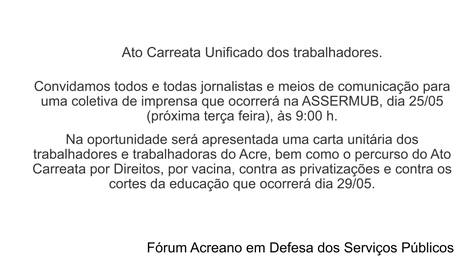 Na oportunidade será apresentada uma carta unitária dos trabalhadores e trabalhadoras do Acre, bem como o percurso do Ato Carreata por Direitos, por vacina, contra as privatizações e contra os cortes da educação que ocorrerá dia 29/05.