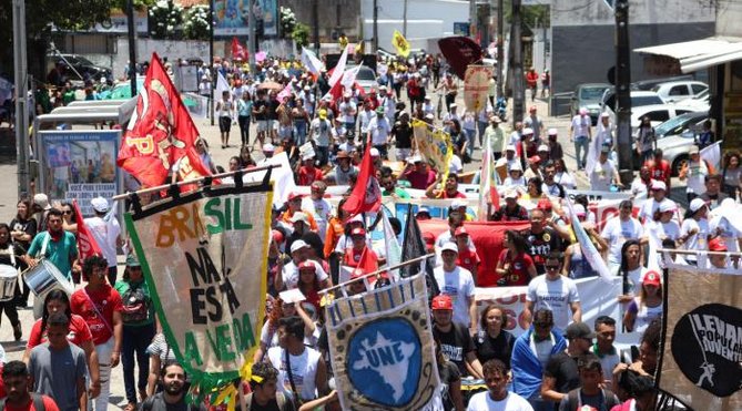 Já no Benfica, corredor cultural e universitário de Fortaleza, os manifestantes se concentraram no cruzamento das Avenidas 13 de Maio com a Universidade, ao lado da Reitoria da Universidade Federal do Ceará (UFC), antes de seguirem em caminhada pelas ruas do bairro em direção a Praça da Justiça Federal (Praça General Murilo Borges), no Centro.