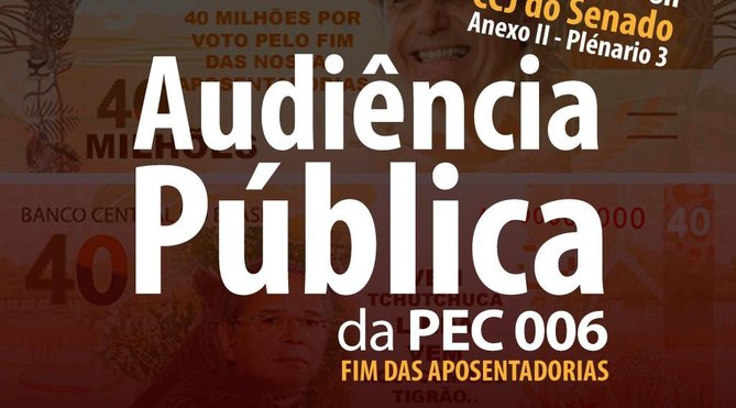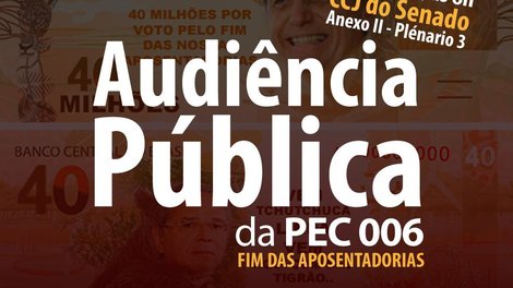 A luta contra o fim das aposentadorias e em defesa da Previdência Social continua. A Federação dos Bancários do Centro-Norte (Fetec-CUT/CN), assim como a CUT Nacional e a CUT Brasília, convida os bancários e trabalhadores a participarem da audiência que será realizada nesta quarta-feira 21 na Comissão de Constituição e Justiça do Senado Federal, às 8h, da PEC 006 que acaba com as aposentadorias. A entrada e ponto de concentração será no anexo II do Senado e a audiência ocorrerá no Plenário 3 da ala Senador Alexandre Costa.