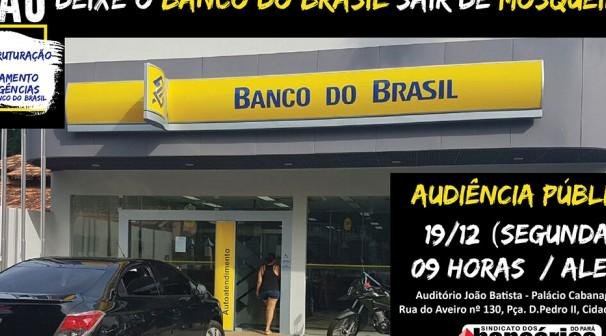Belém Pa - A audiência pública sobre os impactos da reestruturação do Banco do Brasil no Pará, convocada pelo deputado estadual Carlos Bordalo (PT) para o dia 12, mudou agora para o dia 19 de dezembro (segunda-feira). O motivo da alteração foi a impossibilidade de participação do superintendente do BB no dia 12.