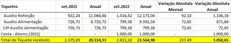 Com essas conquistas, já em setembro de 2022, o total mensal do VR sobe de R$ 922,24 a R$ 1.014,42, e o do VA, de R$ 726,73 a R$ 799,38. Considerados os montantes recebidos a título de 13ª cesta (R$ 799,38) e do adicional de R$ 1.000, o total recebido por bancários e bancárias em verbas relacionadas a alimentação, no período de 12 meses, salta de R$ 20.514,33 para R$ 23.564,98, um aumento nominal de R$ 3.050,65.