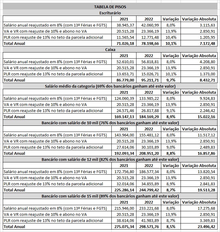 Após dois meses e meio de duras negociações, o Comando Nacional dos Bancários arrancou da Federação Nacional dos Bancos (Fenaban) uma proposta para 2022 e 2023. Para este ano, a categoria terá reajuste de 8% nos salários, aumento de 10% nos vales alimentação (VA) e refeição (VR), além de um adicional de R$ 1.000,00 em vale alimentação, a ser creditado até outubro de 2022. A proposta também prevê reajuste de 13% para a parcela adicional da Participação nos Lucros e Resultados (PLR) neste ano e, para 2023, aumento real de 0,5% (INPC + 0,5%) para salários, PLR, VA/VR e demais cláusulas econômicas.