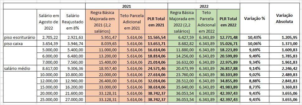 “Com o constante crescimento nos lucros dos bancos, o aumento do teto da parcela adicional da PLR possibilita maiores ganhos para os trabalhadores”, observou a presidenta da Confederação Nacional dos Trabalhadores do Ramo Financeiro (Contraf-CUT) e coordenadora do Comando Nacional dos Bancários, Juvandia Moreira.