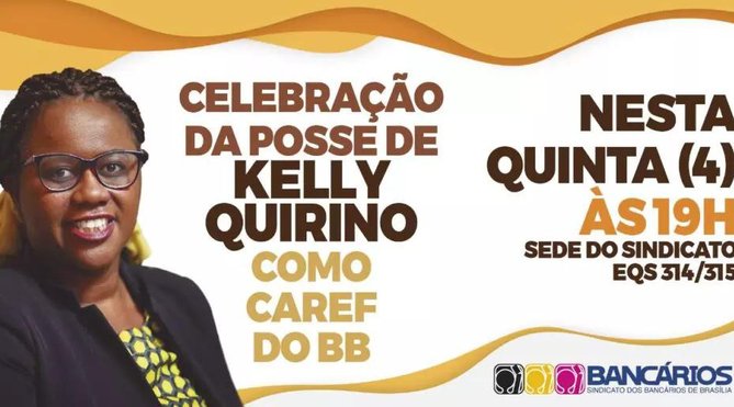 A nova representante dos funcionários no Conselho de Administração do Banco do Brasil, Kelly Quirino, faz nesta quinta-feira 4 celebração da posse como Caref em evento na sede do Sindicato dos Bancários de Brasília (EQS 314/315), a partir das 19h. Apoiada pela Federação dos Bancários do Centro-Norte (Fetec-CUT/CN), a conselheira assumiu oficialmente o cargo na última quinta (27).