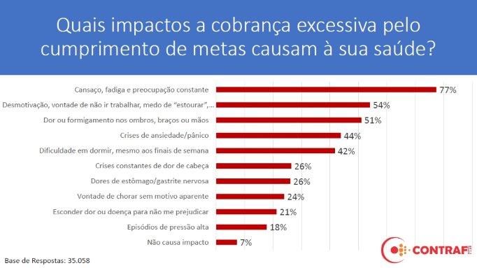 A consultoria contratada pela Fenaban apresentou dados com base em números dos próprios bancos. “É claro que os números dos Recursos Humanos dos bancos não vão apontar as metas como causa do adoecimento. Nós ouvimos a categoria, que disse o contrário. As metas são sim a principal causa do adoecimento”, disse a presidenta do Sindicato dos Bancários de São Paulo, Osasco e Região (Seeb/SP), Ivone Silva, ao lembrar da Consulta Nacional 2022, respondida por mais de 35 mil bancários, dos quais 77% acredita que a cobrança excessiva pelo cumprimento de metas causam cansaço, fadiga e preocupação constante; 54% dizem que causa desmotivação, vontade de não ir trabalhar, medo de estourar; 51% diz causar dor, formigamento nos ombros, braços ou mãos; 44% que causa crise de ansiedade e pânico (veja outros resultados no gráfico).