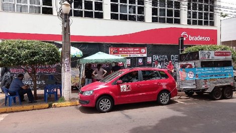 O Sindicato dos Bancários de Dourados e Região participa da manifestação com fechamento da principal agência do Bradesco na cidade, que foi totalmente envelopada com lona preta com inscrições de frases e panfletagem denunciando à população a desumanidade do banco que demite em massa pais e mães de família em plena pandemia, mesmo depois de ter se comprometido a não demitir.