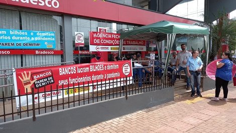 Bancários de todo o país realizam, nesta quinta-feira (12), manifestações em agências e departamentos do banco Bradesco para protestar contra as demissões realizadas pelo banco. Em Dourados a manifestação acontece na Agência 2023 do Bradesco que fica na região central da cidade.