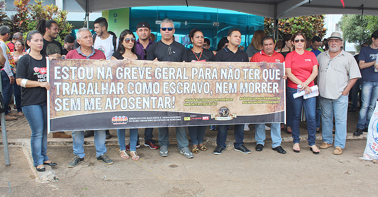 "Estamos unidos com todos os trabalhadores e a sociedade em geral porque entendemos que essa tentativa de retirar direitos e obrigar que as pessoas morram sem ter direito à aposentadoria é uma aberração sem tamanho, uma vergonha que não pode ser defendida por nenhum ser humano de bem. Por isso estamos aqui para afirmar que os deputados federais e senadores que, supostamente, votem a favor desta reforma, não serão reeleitos, pois o povo já deixou bem claro que essa iniciativa deste governo ilegítimo só é interessante para os poderosos, principalmente os bancos, que lucrarão ainda mais caso a aposentadoria pública seja destruída, já que só restará à população a aposentadoria privada", mencionou José Pinheiro, presidente do Sindicato dos Bancários e Trabalhadores do Ramo Financeiro de Rondônia (SEEB-RO).