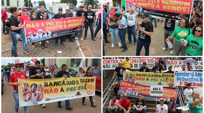 Porto Velho RO - A exemplo do que aconteceu em todo o pais, os bancários de Rondônia também participaram do Dia Nacional de Greve e Paralisações, convocado pelas centrais sindicais e que aconteceu na manhã desta sexta-feira, 11 de novembro. Os principais motes dos protestos e paralisações são a rejeição à PEC 241 (agora PEC 55 no Senado) que congelará por 20 anos os investimentos em serviços públicos essenciais à população, especialmente nas áreas da Saúde (Sistema Único de Saúde) e Educação (pública e gratuita), à reforma da Previdência e a uma reforma trabalhista que retira direitos garantidos e conquistados pela classe trabalhadora, a começar pela terceirização sem limites da PEC 30.