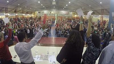 Luta conjunta – A assembleia dos bancários contou com dirigentes da Central Única dos Trabalhadores (CUT), do Movimento Sem-Terra (MST) e de categorias que fazem campanha neste segundo semestre, como os metalúrgicos, reforçando a luta conjunta contra o rebaixamento dos salários e a retirada de direitos.