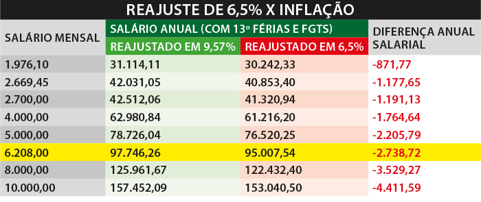 Em rodada de negociação realizada no dia 29, a federação dos bancos apresentou ao Comando Nacional dos Bancários índice de reajuste salarial de 6,5% que representa perda real de 2,8% (de acordo com a inflação de 9,57%). Além dos salários (veja quadro), esse reajuste rebaixado significaria, em um ano, uma perda de R$ 436,39 nos vales-alimentação e refeição, se levada em conta essa inflação projetada.