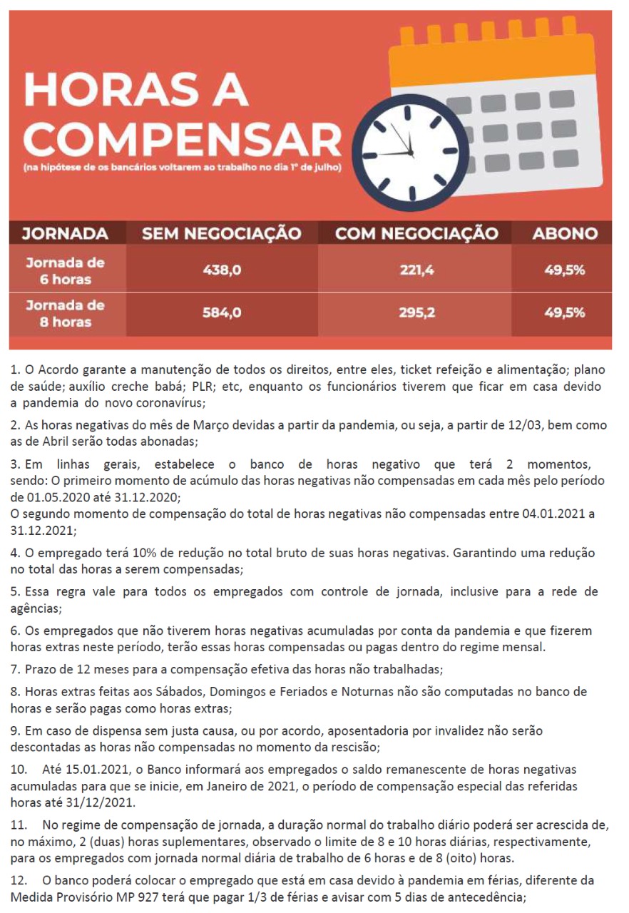 Além disso, os trabalhadores terão desconto de 10% nas horas devidas. Por exemplo, se o bancário sair da quarentena devendo 200 horas, ele só terá de compensar 180 horas, pois 20 horas (10% das horas devidas) serão abonadas.
