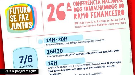 Acompanhe ao vivo, a partir das 17h, a transmissão da abertura da 26ª Conferência Nacional dos Bancários em https://youtube.com/live/17uACMRULUo?feature=share