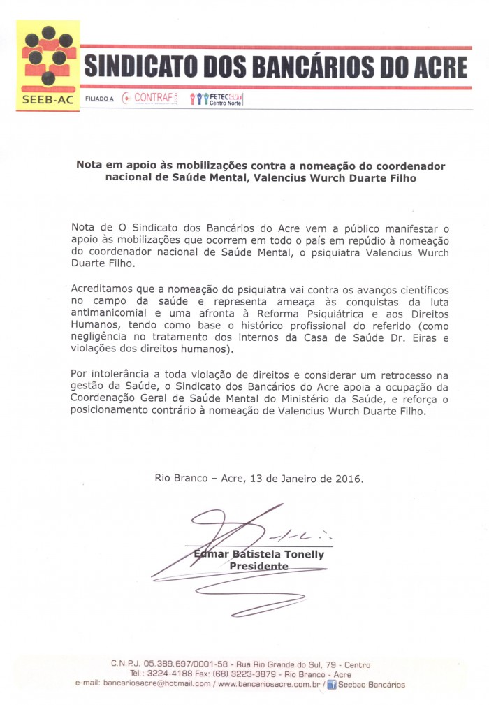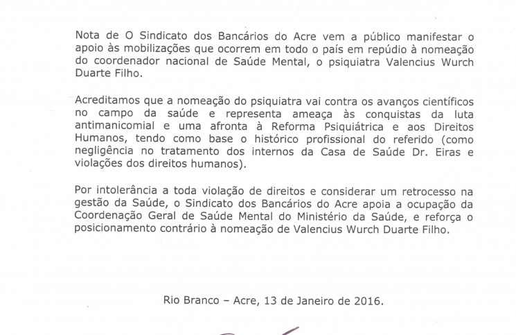 Bancários do Acre são contra a nomeação de Valencius Wurch para coordenação nacional de saúde mental