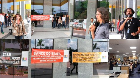 Brasília - Bancários do Banco do Brasil realizaram nesta quinta-feira (18) um Dia Nacional de Luta em Defesa da Cassi e contra os descomissionamentos que estão ocorrendo no banco. Com faixas e entrega de material específico sobre a Caixa de Assistência, o Sindicato protestou em Brasília em frente à sede do banco, no Setor de Autarquias Norte, além de promover reuniões nos locais de trabalho.