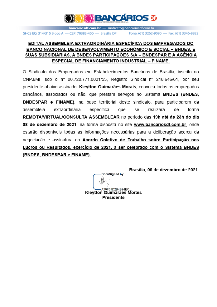 O Sindicato convoca os bancários do Sistema BNDES (BNDES, BNDESPAR e FINAME) para assembleia remota a ser realizada nesta quarta-feira (8) para decidir sobre a proposta de acordo coletivo de trabalho referente à Participação nos Lucros ou Resultados (PLR), exercício 2021.