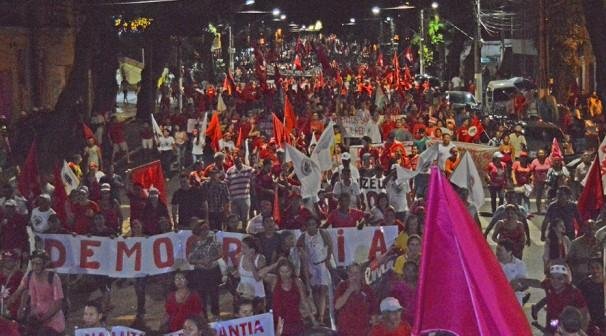 Belém PA - Na última sexta-feira, 18 de março, o Sindicato dos Bancários do Pará participou em Belém da manifestação nacional de rua em defesa da democracia convocada pela Frente Brasil Popular, da qual esta entidade sindical faz parte, juntamente com a CUT, Contraf-CUT, Fetec-CUT Centro Norte, CTB, MST, UNE, CMP, MAB, Marcha Mundial das Mulheres e dezenas de entidades do movimento social. Também ocorreram manifestações em outras cidades paraenses, como Santarém, Marabá e Tucuruí.