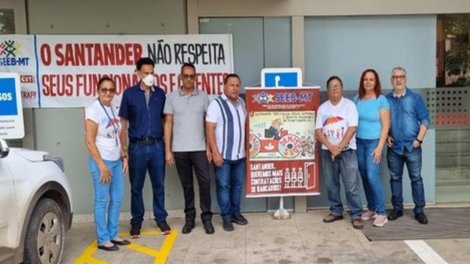 Como forma de protestar contra as terceirizações, o Sindicato dos Bancários de Mato Grosso (SEEB-MT) realizou um ato em frente à agência Santander Select, em Cuiabá nesta sexta-feira (07). A ação marcou o dia de luta nacional contra o Santander que age contra os trabalhadores em todo país.