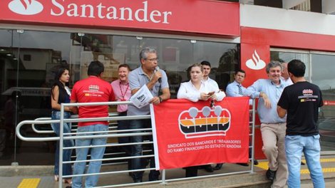 Com o uso de carro de som, panfletos e faixas, os bancários levaram aos clientes, usuários e população em geral as recentes medidas tomadas pelo Santander, de forma unilateral, e que atacam diretamente os direitos de seus funcionários. Entre as medidas reprovadas pelos trabalhadores - e que foram 'empurradas goela abaixo' pelo banco - está a implantação de um sistema que força os trabalhadores a assinarem um Acordo Individual de Banco de Horas Semestral, que é inconstitucional e que não foi negociado com os representantes dos trabalhadores e que o banco se recusar a negociar.