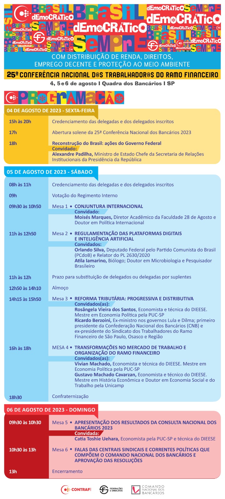 Confira a seguir a programação oficial completa da 25ª Conferência Nacional d@s Trabalhador@s do Ramo Financeiro.