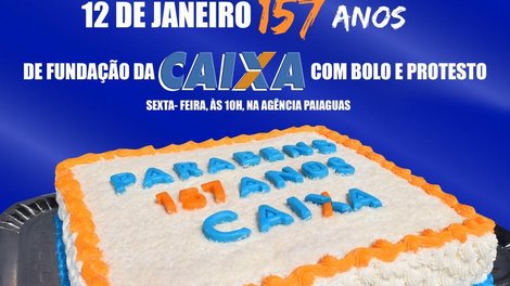 Cuiabá MT - A Caixa Econômica Federal completa 157 anos, nesta sexta-feira, 12 de janeiro. Para comemorar o aniversário de fundação da Caixa, único banco do país totalmente público voltado ao atendimento da população em geral, o Sindicato dos Bancários realizará Ato Público com distribuição de bolo, na porta da Agência Paiaguás, Centro de Cuiabá, às 10h.