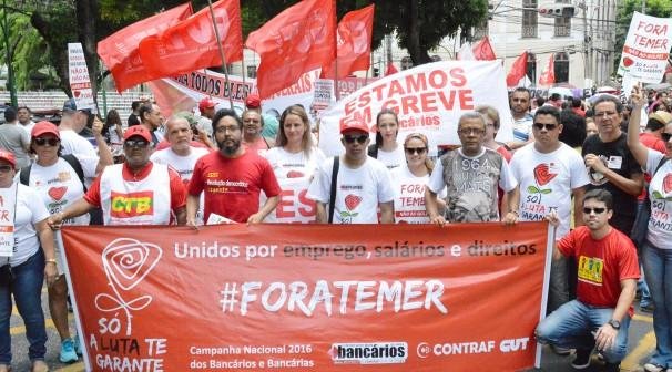 Durante a passeata, a categoria bancária presente na manifestação fez críticas à política trabalhista de Michel Temer, que pretende privatizar bancos e empresas públicas, ampliar a jornada de trabalho para 12 horas diárias, congelar gastos públicos por 20 anos (PEC 241/16), acabar com o aumento real do salário mínimo, congelar salários dos servidores públicos e acabar com os concursos públicos, (PLP 257/16), além de aprovar a terceirização em todas as áreas do setor público e privado (PLC 30), a reforma trabalhista que diminui a idade mínima para ingresso no mercado de trabalho e amplia a idade mínima para aposentadoria, dentre outras propostas que compõe o pacote de maldades de Temer para a classe trabalhadora.