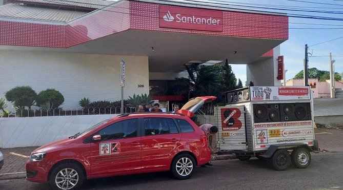 Em protesto e cobrando respeito aos trabalhadores, o Sindicato dos Bancários de Dourados e Região MS realizou manifestação na manhã desta quarta-feira (20) no Santander, Agência João Candido Câmara, na região central de Dourados. Com carro de som e faixas os bancários denunciaram aos clientes e usuários o descaso do banco espanhol com o Brasil e com os brasileiros. Além do protesto na frente da agência que teve a sua abertura retardada em uma hora, o sindicato aproveitou a oportunidade para se reunir com os funcionários no interior da agência, discutir o assunto e falar também da campanha nacional dos bancários.
